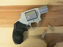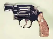 A snubnosed revolver (colloquially known as a snubbie, belly gun, or bulldog revolver) is a small, medium, or large frame revolver with a short barrel, generally less than 4 inches in length. Smaller such revolvers are often made with "bobbed" or "shrouded" hammers and there are also "hammerless" models (where the firing pin is entirely internal); the point is to allow the gun to be drawn with little risk of it snagging on clothing. Since the external movement of the mechanism is minimal or nil, shrouded and hammerless models may be fired from within clothing.[1] The design of these revolvers compromises range and accuracy at a distance in favor of maneuverability and ease of carry and concealment.