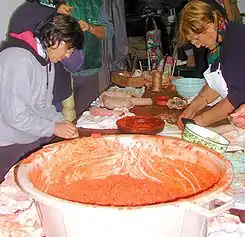 Sobrassada in Balearic or Sobrasada in Spanish, is a raw, cured sausage from the Balearic Islands (Spain) made with ground pork, paprika, salt and other spices. Sobrassada, along with botifarró, are traditional Balearic meat products prepared in the laborious but festive rites that still mark the autumn and winter pig slaughter known as a matança in Minorca, Majorca and Ibiza. The chemical principle that makes sobrassada is the dehydration of meat under certain weather conditions (high humidity and mild cold) which are typical of the late Balearic autumn.
