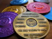 "Alcoholics Anonymous is a fellowship of people who share their experience, strength, and hope with each other that they may solve their common problem and help others to recover from alcoholism."[6][7] To show how far along each person is in his or her sobriety, most AA groups use a chip of a particular color or alloy that constitutes a range of time that person has been sober.[8] These different-colored chips and values are meant to be tokens of inspiration and a reminder of just how long the member has been sober and how far that member has come. It is evident that "early on, many people in A.A. carried personal mementos to remind themselves of the importance of their sobriety".[9] From personal mementos to coins, the practice of giving out something such as a sobriety chip represents the will and desire that a person has to quit drinking. The practice of giving sobriety chips in AA is attributed to a group in Elmira, New York, in 1947. The celebration of birthdays came from the Oxford group, where members celebrated the anniversary of their spiritual rebirth; in Alcoholics Anonymous, people choose the anniversary of the date of their first full day without a drink. There are fourteen basic coins that are given to members within their first year of sobriety. Generally, coins are given at one month, three months, six months, and nine months of sobriety in the first year. After this, coins are given after each yearly milestone.
