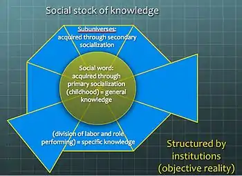 The general body of knowledge is socially distributed, and classified in semantic fields. The dynamic distribution and inter dependencies of these knowledge sectors provide structure to the social stock of knowledge: