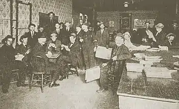 The Astoria Finnish Socialist Club (ASSK) was established in 1904 as a branch of the Finnish Socialist Federation (SSJ),[29] an organization which would formally affiliate with the Socialist Party of America on January 1, 1907. The organization gave Finnish adherents of socialism a venue through which they could meet with like minded others and, at least as importantly, meet with other Finnish speakers — throughout their history the language federations of the American socialist movement had both political and social aspects.[29] Membership in the ASSK was open to all Finns at least 18 years of age who accepted basic socialist doctrine and paid minimal dues.[30]