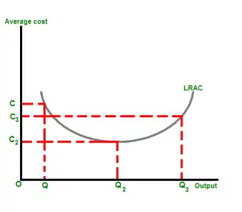 This long-run average cost diagram shows that as more is produced, so long as output does not exceed OQ2, economies of scale are obtained. Beyond OQ2, additional production will increase per-unit costs, reflecting diseconomies of scale. Consequently, the societally optimal firm size is OQ2, where long-run average cost is at its lowest level.