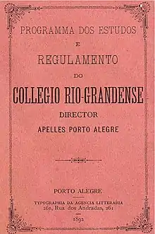 The Parthenon sought to expand the culture of the province by supporting or sponsoring several elementary and secondary schools in Porto Alegre,[48] and offering night courses for adults.[14] It created a library with 6 thousand volumes of important works, and a museum, one of the first in the province, with a collection of more than 4 thousand items divided into the sections of Mineralogy, Archaeology, Numismatics, Botany and Zoology.[8][92] The Parthenon had the intention of founding an academy (university), which if it had materialized would have been the first in the province.[36] It also encouraged the creation of libraries in several municipalities to expand the reading public.[93][14] The society also developed plans for women's education on a large scale, which also did not materialize.[94] Many of the Parthenon members were teachers and some founded prestigious schools, such as the Porto-Alegre brothers, Hilário Ribeiro, Vasco de Araújo, and Bibiano Francisco de Almeida.[95]