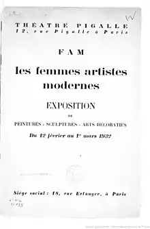 The Society of Modern Women Artists (La Société des femmes artistes modernes, FAM) was created in Paris in 1930 as an association for modern women artists. They organized an annual salon from 1931 to 1938. Through these exhibitions they showed modern works of art by French and international women artists, to establish the presence of women in art and to gain recognition from the general public.[1][2] FAM's exhibitions are considered "a significant force towards putting women artists on a more equal footing" with male artists in France.[3]
