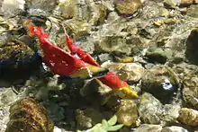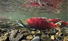 Sockeye salmon exhibit many different life histories with the majority being anadromous where the juvenile salmon migrate from freshwater lakes and streams to the ocean before returning as adults to their natal freshwater to spawn.[15] Similar to most Pacific salmon, sockeye salmon are semelparous, meaning they die after spawning once. Some sockeye, called kokanee, do not migrate to the ocean and live their entire lives in freshwater lakes.[16] The majority of sockeye spawn in rivers near lakes and juveniles will spend one to two years in the lake before migrating to the ocean, although some populations will migrate to saltwater in their first year.[17] Adult sockeye will spend two to three years in the ocean before returning to freshwater. Females will spawn in 3–5 redds over a period of several days. The eggs usually hatch within six to nine weeks and the fry typically rear in lakes before migrating to the ocean.[18]