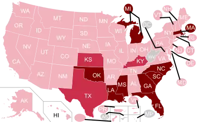 Sodomy laws in the United States, which outlawed a variety of sexual acts, were inherited from colonial laws in the 17th century.[1] While they often targeted sexual acts between persons of the same sex, many statutes employed definitions broad enough to outlaw certain sexual acts between persons of different sexes, in some cases even including acts between married persons.