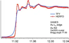 In synchrotron facilities those measurement can be done at the same time, yet the experiment setup is quite complex and needs exact and fine tuned crystal monochromators to diffract the tangential beam coming from the electron storage ring. Method is called HERFD, which stands for High Energy Resolution Fluorescence Detection. The collection method is unique in that, after a collection of all wavelengths coming from "the source" called , the beam is then shone onto the sampleholder with a detector behind it for the XANES part of the measurement. The sample itself starts to emit X-rays and after those photons have been monochromatized they are collected, too. Most setups use at least three crystal monochromators or more. The is used in absorption measurements as a part of the Beer-Lambert Law in the equation