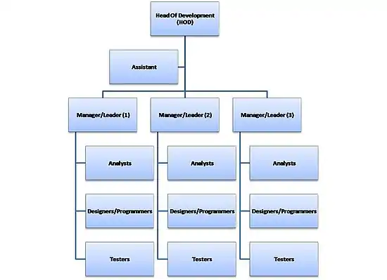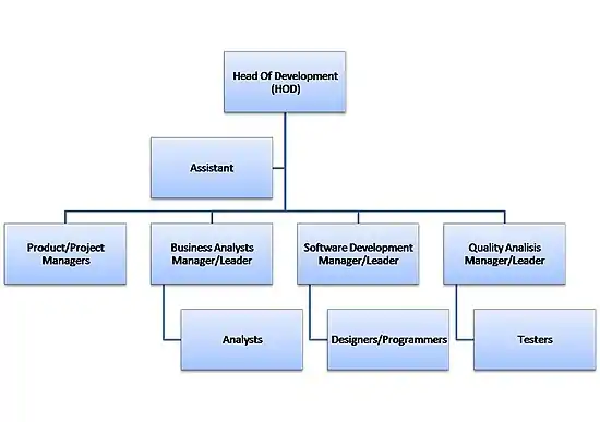 The manager of a software company is usually called the Head Of Development (HOD),[3] and reports to the stakeholders. He or she leads the sub-teams directly or via the managers/leaders depending on the size of the organization. Usually teams of up to 10 person are the most operational. In bigger organizations, there are in general two models of the hierarchy: