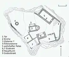 The ruins of the castle are located on a steep hill west of Trin village. The ruins of the Church of St. Pancras are located in the center of the 50 by 80 meters (160 ft × 260 ft) flat top of the hill. The simple church building is oriented along an approximate east-west axis. It dates from about 1100 and may have replaced an earlier church. A rectangular cistern or baptistery was added in the 12th century.[6] The 11th or 12th century tower south of the tower is 11 m × 7 m (36 ft × 23 ft) with walls that are up to 1.8 m (5.9 ft) thick. The palas to the north was added in the 13th century and is 18 m (59 ft) long.[3]