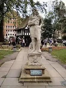 By the early 19th century, the statue, fountain and attendant figures was described as "in a most wretched mutilated state; and the inscriptions on the base of the pedestal quite illegible".[2] In 1875, it was removed during alterations in the square by Thomas Blackwell, of Crosse & Blackwell, the condiment firm (which had premises at № 20-21 Soho Square from the late 1830s until the early 1920s), who gave it for safekeeping to his friend, artist Frederick Goodall, with the intention that it might be restored.[2] Goodall placed the statue on an island in his lake at Grim's Dyke, where it remained when dramatist W. S. Gilbert purchased the property in 1890, and there it stayed after Gilbert's death in 1911. In her will, Lady Gilbert directed that the statue be returned, and it was restored to Soho Square in 1938.[4]