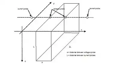 In the Schlumberger method[4][6][7] the distance between the voltages probe is a and the distances from voltages probe and currents probe are c (see figure above).