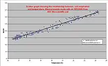 When using linear regression, multiple data points are graphed and the points can be fitted with a linear regression equation, which will provide a slope. This slope can provide the rate of soil respiration with the equation , where F is the rate of soil respiration, b is the slope, V is the volume of the chamber and A is the surface area of the soil covered by the chamber.[17] It is important that the measurement is not allowed to run over a longer period of time as the increase in CO2 concentration in the chamber will also increase the concentration of CO2 in the porous top layer of the soil profile. This increase in concentration will cause an underestimation of soil respiration rate due to the additional CO2 being stored within the soil.[18]