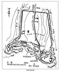 Sokol is built on tall and steep rock. The fortification system consists of the citadel - the upper town. The citadel itself consists of two fortified wholes. On the tallest ridge, there is an irregular shaped wall built partly around the rock, with two towers. One tower was protruded on the south side, and the other - main tower was facing the lower town (where the monastery is today). Under this tower, there is a remain of a water cistern. The entire side of the cliff under the main tower was walled by a 35–40 meters tall walls. In the lower part of the citadel there was one rectangle-based tower, which was the access point to the upper part of upper Soko. Under this gate tower, there were two more similar towers, facing the lower town. Inside the lower part of upper town, there are still visible traces of more fortification objects.