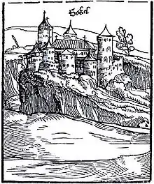 Sokograd was probably built at the end of the first half of the 13th century when the first stronger fortresses began to be built in the then Banate of Bosnia. During his attack on Bosnia, King Lajos I of Anjou tried to capture it in July 1363 but was prevented from doing so by the heroic defense of the city and they withdrew after three days of fighting. At the head of the defense was Knyaz Vukac Hrvatinić, father of more prominent Grand Duke of Bosnia, Hrvoje Vukčić Hrvatinić.[3] Knyaz Vukac, on these merits, received the Sokograd with entire župa of Pliva from Ban Tvrtko, and was bestowed with a title of duke. The Hungarians tried again to capture the city in 1405 but were defeated again. The King of Bosnia, Stephen Tomašević, spent a short time in the fortress during the period in which the Kingdom of Bosnia collapsed under the Ottoman invasion, after which it was recaptured by the Kingdom of Hungary. During the battles between the Ottomans and the Hungarians in the second half of the 15th and the beginning of the 16th century, Sokograd was part of the Hungarian Jajce Banovina up until 1518-1521.[4] The Ottomans finally occupied it in 1518,[5] or in 1521.[6] During the 16th century, it was mentioned as one of the 9 Vlach principalities of Bosnia.[7] Sokograd served the Ottoman Empire until 1833 when it was abandoned by Ottoman Garrisons. The Fortress along with the rest of Bosnia was incorporated into the Austro-Hungarian Empire in 1878.[8]