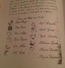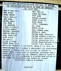 According to Edith Durham, in 1912 Montenegro worked hard to rise the Malissori in exchange for arms and freedom, and they believed Montenegro's claimed intent to 'liberate their brethren'.[12] During her war correspondence in the winter of 1913, Durham details her conversation with Sokol Baci and his son, Kole Sokoli, who stated that they were fighting to free Albania from the Ottomans.[15] After the Montenegrin conquest of Scutari (1913), Nicholas I appointed Sokol Baci the commander (vojvoda) and brigadier of Scutari. When congratulated on his appointment, Sokol replied, "He who does not see through the screen, may his eyes fall out!" On May 26, 1913, 130 leaders of the Gruda, Hoti, Kelmendi, Kastrati and Shkreli sent a petition to Cecil Burney in Shkodër against the incorporation of their territories into Montenegro.[16] Sokol broke ties with Nicholas I and lived in Shkodër for the remainder of his life. On November 14, 1918, Luigj Gurakuqi, Anton Harapi and Gjergj Fishta led the leaders of the Hoti and Gruda on a march from Montenegro to Shkodër, where they submitted a memorandum to the French Colonel, Bardy de Fourton. The memorandum was addressed to the Ministers of Foreign Affairs in Washington, London, Paris and Rome requesting that Hoti and Gruda be united with Albania, signed by the chiefs of Gruda, including Sokol's closest cousins, Dede Nika Ivezaj, Zef Martini Ivezaj, Mirash Hasi Ivezaj and Marash Pllumi Ivezaj.[17]