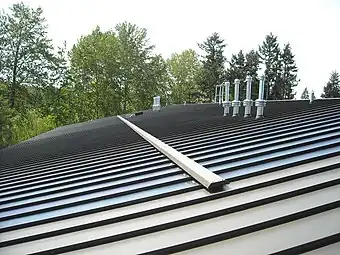 With the increasing efficiencies of thin film solar, installing them on metal roofs has become cost competitive with traditional Monocrystalline and Polycrystalline solar cells. The thin film panels are flexible and run down the standing seam metal roofs and stick to the metal roof with Adhesive, so no holes are needed to install. The connection wires run under the ridge cap at the top of the roof. Efficiency ranges from 10-18% but only costs about $2.00-$3.00 per watt of installed capacity, compared to Monocrystalline which is 17-22% efficient and costs $3.00-$3.50 per watt of installed capacity. Thin film solar is light weight at 7-10 ounces per square foot. Thin film solar panels last 10–20 years[20] but have a quicker ROI than traditional solar panels, the metal roofs last 40–70 years before replacement compared to 12–20 years for an asphalt shingle roof.[21][22]