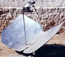 Parabolic troughs are used to concentrate sunlight for solar-energy purposes. Some solar cookers have been built that use them in the same way.[11] Generally, the trough is aligned with its focal line horizontal and east–west. The food to be cooked is arranged along this line. The trough is pointed so its axis of symmetry aims at the Sun at noon. This requires the trough to be tilted up and down as the seasons progress. At the equinoxes, no movement of the trough is needed during the day to track the Sun.[12] At other times of year, there is a period of several hours around noon each day when no tracking is needed. Usually, the cooker is used only during this period, so no automatic Sun tracking is incorporated into it. This simplicity makes the design attractive, compared with using a paraboloid. Also, being a single curve, the trough reflector is simpler to construct. However, it suffers from lower efficiency.