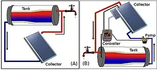 Active systems have controllers with features such as interaction with a backup electric or gas-driven water heater, calculation and logging of the energy saved, safety functions, remote access and informative displays.