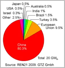 As of 2017, global solar hot water (SHW) thermal capacity is 472 GW and the market is dominated by China, the United States and Turkey.[3] Barbados, Austria, Cyprus, Israel and Greece are the leading countries by capacity per person.[3]