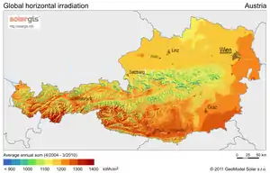 Austria has also a large capacity of solar heating at its disposal. With more than 3,500 MWthermal the country ranks second in the EU, only behind much larger Germany.[6]