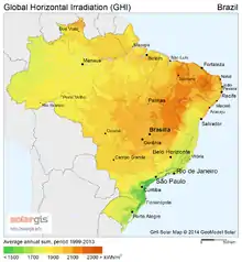 Brazil expects to have 1.2 million solar power generation systems in the year 2024.[6] Solar energy has great potential in Brazil, with the country having one of the highest levels of insolation in the world at 4.25 to 6.5 sun hours/day.[7] As of 2019, Brazil generated nearly 45% of its energy, or 83% of its electricity, from renewable sources. For example, 60% of Brazil's electricity generation came from renewable hydropower. [8] However, to meet energy demands in the entire country, and to diversify its energy portfolio, other renewable energy systems, such as solar power, are being expanded.[9]