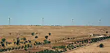 Jordan currently operates three wind power plants at Ibrahimyah, Hofa and Tafila. The Ibrahimyah plant, located approximately 80 km north of Amman, consists of 4 wind turbines with capacity 0.08 MW for each.[29] The Hofa plant, located approximately 92 km north of Amman, consists of 5 wind turbines with capacity 0.225 MW for each.[30] The Tafila Wind Farm is located in Tafilah Governorate in south-west Jordan.[31] The Tafila Wind Farm has a capacity of 117 MW and produces 390 gigawatt-hours annually powering 83,000 homes.[32]