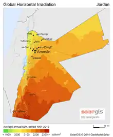 Jordan lies within the solar belt of the world with average solar radiation ranging between 5 and 7 kilowatt-hour (kWh) per square metre. Decentralized generation from photovoltaic systems in rural and remote villages is currently used for lighting, water pumping and other social services of up to 1000 kW of peak capacity. In addition, about 15% of all households are equipped with solar water heating systems.[20] In May 2012, a 280 kW solar electricity system was inaugurated to be used at El Hassan Science City.[21]