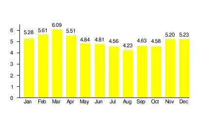 ![]() Daily insolation in Bangkok with an average of 5.04 hours of sun per day.[8] |
