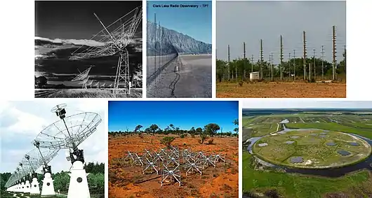 Routine imaging of the radio Sun began in 1967 with the commissioning of the Culgoora Radioheliograph, which operated until 1986.[10] A radioheliograph is simply an interferometer that is dedicated to observing the Sun. In addition to Culgoora, notable examples include the Clark Lake Radioheliograph,[11] Nançay Radioheliograph, Nobeyama Radioheliograph, Gauribidanur Radioheliograph, Siberian Radioheliograph, and Chinese Spectral Radioheliograph.[12] Additionally, interferometers that are used for other astrophysical observations can also be used to observe the Sun. General-purpose radio telescopes that also perform solar observations include the Very Large Array, Atacama Large Millimeter Array, Murchison Widefield Array, and Low-Frequency Array. The collage above shows antennas from several low-frequency radio telescopes used to observe the Sun.