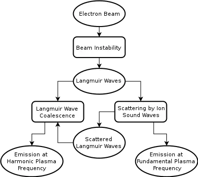 Langmuir waves are produced in the solar corona by a plasma instability that occurs when a beam of nonthermal (fast-moving) electrons moves through the ambient plasma.[25] The electron beam may be accelerated either by magnetic reconnection, the process that underpins solar flares, or by a shock wave, and these two basic processes operate in different contexts to produce different types of solar radio bursts.[26] The instability that generates Langmuir waves is the two-stream instability, which is also called the beam or bump-on-tail instability in cases such as this where an electron beam is injected into a plasma, creating a "bump" on the high-energy tail of the plasma's particle velocity distribution.[23] This bump facilitates exponential Langmuir wave growth in the ambient plasma through the transfer of energy from the electron beam into specific Langmuir wave modes. A small fraction of the Langmuir wave energy can then be converted into electromagnetic radiation through interactions with other wave modes, namely ion sound waves.[23] A flowchart of the plasma emission stages is shown on the right.