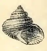 The color of the shell is yellowish white, shot on the upper side with a dark iridescence. The spirals are black, clouded, and broken with oblique longitudinal streaks of white.