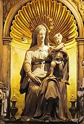 In Rome, in the Basilica of S. Augustine, the feast of the "Maternity of the Blessed Virgin Mary" was celebrated with an octave, in honour of the miraculous statue of the Madonna del Parto by Jacopo Sansovino. For centuries, the people of Rome and its environs have invoked the intercession of the Madonna before this statue asking for safe deliveries and healthy babies. The statue is laden with thank-offerings and always surrounded by offerings of flowers and candles, and often photographs of smiling infants and toddlers, "visual evidence of faith in holy intercession".[14]