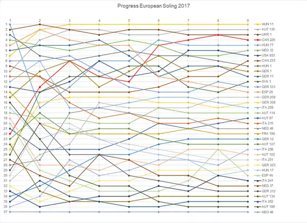 | Rank | Country | Helmsman | Crew | Sail No. | Race 1 | Race 2 | Race 3 | Race 4 | Race 5 | Race 6 | Race 7 | Race 8 | Race 9 | Total | Total – discard | |||||||||