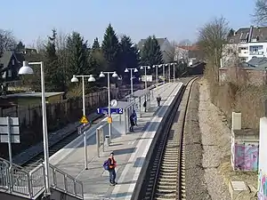 Solingen Grünewald station is in the city of Solingen in the German state of North Rhine-Westphalia. It is on the Wuppertal-Oberbarmen–Solingen railway. The line through the site of Solingen Grünewald station was opened on 12 February 1890 as part of the Solingen–Wuppertal-Vohwinkel line, known as the Korkenzieherbahn ("Corkscrew Railway"), to Vohwinkel.[6] The station was opened on 6 May 2006.[5] It is classified by Deutsche Bahn as a category 3 station.[1]