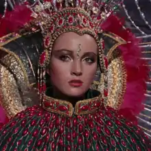 The emphasis on Solitaire's chastity is conveyed, to begin with, by the high neckline of her first appearance in ethnic dress, and the colour red, which, with its associations with blood, and, in turn, menstruation and childbirth, is simultaneously used to foreshadow a bride's loss of virginity and future fertility in ethnic bridal gowns. Later, in St Monique, the bridal motif is pursued through a more revealing red dress, elaborate headdress, and a green cape studded with red stones; since Solitaire is about to lose her virginity to Bond, her neckline has dropped. Back in New York, the neckline plunges down to a butterfly appliqué stitched on the high waist of the red and gold dress she wears on her last tarot reading session.[5]