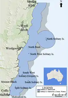 Solitary Islands Marine Park (SIMP) is a marine park in New South Wales State waters, Australia. It adjoins the Solitary Islands Marine Reserve (Commonwealth Waters) and was declared under the Marine Parks Act 1997 (NSW) in January 1998.[2] Prior to this it was declared a marine reserve in 1991.[3] The Park was one of the first declared in NSW and stretches along the northern NSW coast, from Muttonbird Island, Coffs Harbour, to Plover Island near Sandon River, 75 kilometres to the north. It includes coastal estuaries and lakes and extends from the mean high water mark, to three nautical miles out to sea, covering an area of around 72 000 hectares.[4] There are five main islands in the Park, North Solitary Island, North West Solitary Island, South West Solitary Island (Groper Island), South Solitary Island and Split Solitary Island, as well as other significant outcrops such as Muttonbird Island and submerged reefs.