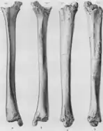 - Tibia B, a nearly complete right tibia measuring 365 mm (14.4 in) in length at 86 mm (3.4 in) in diameter at the mid-shaft, probably belonging to an adult female;