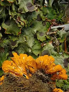 Solorina crocea is often infected by Rhagadostoma lichenicola, a lichenicolous (lichen-dwelling) fungus. Infection results in the appearance of crowded blackish ascomata on the upper surface of the host thallus and a highly branched, dark mycelium below the fruitbodies. Its presence does not seem to affect the fertility of the lichen, suggesting that the fungus requires the function and integrity of the host to remain intact. The abundance of certain strains in the associated bacterial community of the lichen has been shown to be altered by the fungal infection. Bacteria normally associated with the lichen include members of the phyla Acidobacteriota, Planctomycetota, and Proteobacteria.[15] Another lichenicolous fungus, Talpapellis solorinae, was described as a new species in 2015 from collections made in North Caucasus; it does not cause distinct damage to the infected host thallus.[33] Other fungi that have been recorded infecting Solorina crocea include Arthonia peltigerina, Cercidospora punctillata, Corticifraga peltigerae,[34] Cercidospora lichenicola, Pyrenidium actinellum,[35] Stigmidium croceae, Protothelenella croceae,[36] Thelocarpon epibolum,[37] and Pronectria robergei. Infection by Stigmidium solorinarium results in the appearance of minute perithecia, while infection by Scutula tuberculosa will result in greyish to black lecideine apothecia.[16]