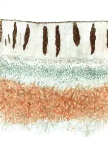 There are six to eight ascospores in each ascus of Solorina crocea. They are brown with an ellipsoid shape, and contain a single transverse septum that divides the spore into two compartments.[14] Based on a sampling of European specimens, the ascospores were measured to be an average of 11.0 μm wide (ranging from 8.4 to 21.2 μm) by 39.0 μm long (ranging from 26.6 to 51.1 μm).[21] The fine details of ascospore structure have been studied using scanning electron microscopy, revealing that there is a consistent, distinctive ornamentation in the spores of each of the most common arctic-alpine Solorina species. In S. crocea, the spores are covered with irregularly shaped papillae (small pimple-like structures), but do not form ridges or reticulations. The tips of the spores are rounded, and there is a slight constriction between the two cells.[22] Solorina octospora has similar spore size and ornamentation as S. crocea, but it does not have solorinic acid nor the subsequent orange-coloured medulla.[21]