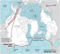 The Solutrean hypothesis on the peopling of the Americas claims that the earliest human migration to the Americas took place from Europe, with Solutreans traveling along pack ice in the Atlantic Ocean.[1][2][3] This hypothesis contrasts with the mainstream academic narrative that the Americas were first populated by people crossing the Bering Strait to Alaska by foot on what was land during the Last Glacial Period[4] or by following the Pacific coastline from Asia to America by boat.[5]