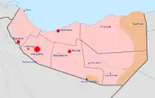 The Somalia–Somaliland border (Somali: Xuduuda Soomaaliya iyo Soomaaliland; Arabic: الحدود بين الصومال وصوماليلاند), is the disputed border between Somalia and the self-declared sovereign state of Somaliland.[2][3][4] It is an international border that separates two countries, while the Somali government and most other countries refer to it as the "Administrative Boundary Line". The government of Somaliland regards itself as the successor itself as the successor independent State of Somaliland, united in 1960 with the Trust Territory of Somaliland.[5]