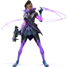 Sombra is classified under the "Damage" role in Overwatch.[17] She is equipped with a low-damage, high-capacity machine pistol for short-range combat.[18] Her abilities allow her to hack enemies and their turrets, which prevents them from using their special or ultimate abilities or picking up health packs, though they may still use primary skills.[18] Sombra's hacks also relay information about the opponent's health and ultimate ability status to her teammates, as long as they are within line-of-sight of the opponent, for about a minute from the hack.[2] Her hacks can also be applied to health packs, allowing them to recharge at three times their normal speed, while also disabling their use for enemies.[19] While her hacks on enemies are short, lasting six seconds, her hacks on health packs can last for a minute, unless hacked again before this minute runs out.[18][19] Sombra may also put down a "translocator" to teleport, and can turn invisible for an infinite amount of time and gain a burst of speed to hide behind enemy lines to perform her hacks.[2] Her ultimate ability is an EMP blast that deals 10k damage to all enemy barriers and shields, along with hacking enemies in the process.[20]