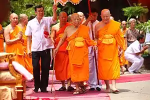 In December 2013, during the protests which led up to the 2014 coup d'état, Somdet Chuang made a public statement opposing the protests, asking protest leaders Phra Suwit Dhiradhammo and Suthep Thaugsuban to stop causing civil unrest, in respect of King Bhumibol's birthday.[43][44] After the coup d'état, the junta started a National Reform Council to bring stability to Thai society, which the junta stated was required before elections could be held.[45] As part of the council, a panel was started to reform Thai religion. This panel was led by Paiboon Nititawan, a former senator who had played a crucial role in the coup. Backed by the bureaucracy, military and Royal Palace, Paiboon sought to deal with any shortcomings in the leading Thai Sangha through legislative means. He was joined by coup leader Phra Suwit Dhiradhammo (known under the activist name Phra Phuttha Issara), a then monk and former infantryman.[36][46]