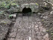 The two images show a spillway drain from c. 1796 (uncovered in 2009–10) at Upper Midford, a location where a caisson to take the canal from the 180 ft (55 m) level to the 134 ft (41 m) level at Midford Aqueduct was proposed.