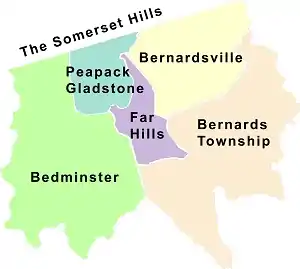 The Somerset Hills is known as the northern region of Somerset County located in the U.S. state of New Jersey and includes the municipalities of Bedminster, Bernardsville, Bernards Township, Far Hills, Peapack & Gladstone. The Morris County communities of the Chesters (borough and township) and the Mendhams (borough and township) are often considered part of the Somerset Hills.[1]