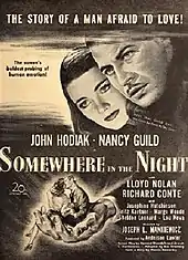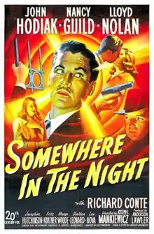 Somewhere in the Night is a 1946 American film noir psychological thriller film directed by Joseph L. Mankiewicz, written by Mankiewicz with Howard Dimsdale and Lee Strasberg from a short story by Marvin Borowsky, and starring John Hodiak and Nancy Guild. The supporting cast features Lloyd Nolan, Richard Conte, Josephine Hutchinson and Sheldon Leonard.