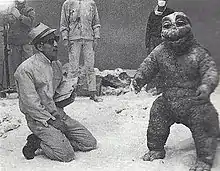 The Godzilla suit built for this film was the biggest in terms of size and girth.[15] This was done in order to give Godzilla a "maternal" appearance and to give a parent-like stature in contrast next to Minilla.[16] Because of the size of the suit, seasoned Godzilla suit actor Haruo Nakajima was only hired to play Godzilla in two scenes because the suit was much too big for him to wear.[17] The smaller suit he had worn for the films Ebirah, Horror of the Deep and Invasion of Astro-Monster was used for these sequences.[18] The much larger Seji Onaka instead played Godzilla in the film, although he was replaced midway through filming by Hiroshi Sekita after he broke his fingers.[6]