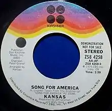 "Song for America" is the title track from the second album of American progressive rock band Kansas. It was written by guitarist/keyboardist Kerry Livgren during the period of heavy touring for their first album. The song was released on their 1975 album Song for America, and later released as the band's third single, although it did not chart. It is known for its symphonic structure, and its lyrics showing America's state before and after colonization. The song is one of Kansas' most well-known songs from their period of obscurity, appearing on most of their collections, live albums and DVDs.