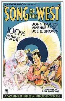 Song of the West is a 1930 American Pre-Code musical western film produced by Warner Bros., and photographed entirely in Technicolor. It was based on the 1928 Broadway musical Rainbow by Vincent Youmans (music), Oscar Hammerstein II (lyrics) and Laurence Stallings (book). It starred John Boles, Joe E. Brown and Vivienne Segal, and was the first all-color all-talking feature to be filmed entirely outdoors.