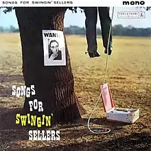 Songs for Swingin' Sellers was released on 4 December 1959 in an eye-catching sleeve depicting "the booted and spurred feet of a man, presumably the artist, hanging from a tree above one of those record players that the adventurous might take on a picnic".[7] The artwork appears in Barry Miles, Grant Scott and Johnny Morgan's book The Greatest Album Covers of All Time, in which it is speculated that the shot of a hanged man may have been inspired by "Mort Sahl's brand of "sick humour"".[38] In addition, the packaging carries several humorous notes, including instructions to "only use needles of Burmese plywood" to play the record and to "send Grandma out of the room".[7][23]